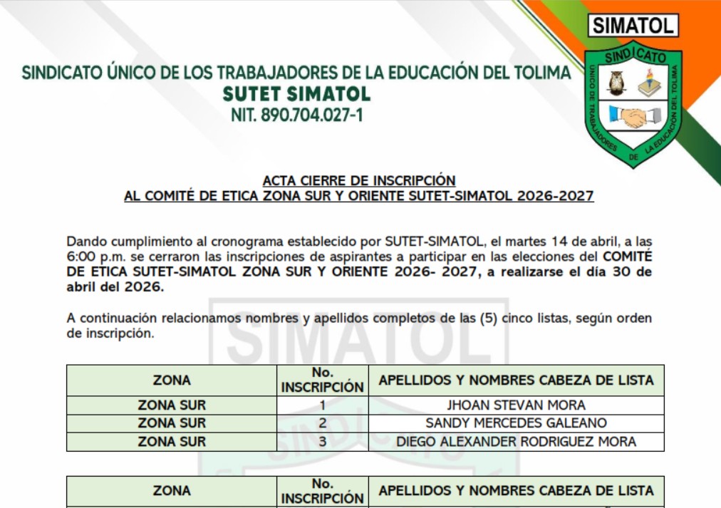 acta cierre inscripción planchas CE 2026 simatol Acta cierre de inscripción al comité de ética zona sur y oriente de SUTET-SIMATOL 2026-2027, Abril 15 de 2026 15 Abr 2026 Comunicados 43 Views Facebook Twitter WhatsAppt Telegram Email Print More Cargando... ¿Tarda demasiado? Recargar el documento | Abrir en una nueva pestaña Descargar Aquí [299.02 KB] acta cierre acta cierre inscripción comité ética 2026 Elecciones Comité Ética SIMATOL 2026 2026-04-15 Tags acta cierre acta cierre inscripción comité ética 2026 Elecciones Comité Ética SIMATOL 2026